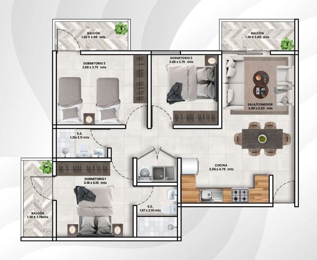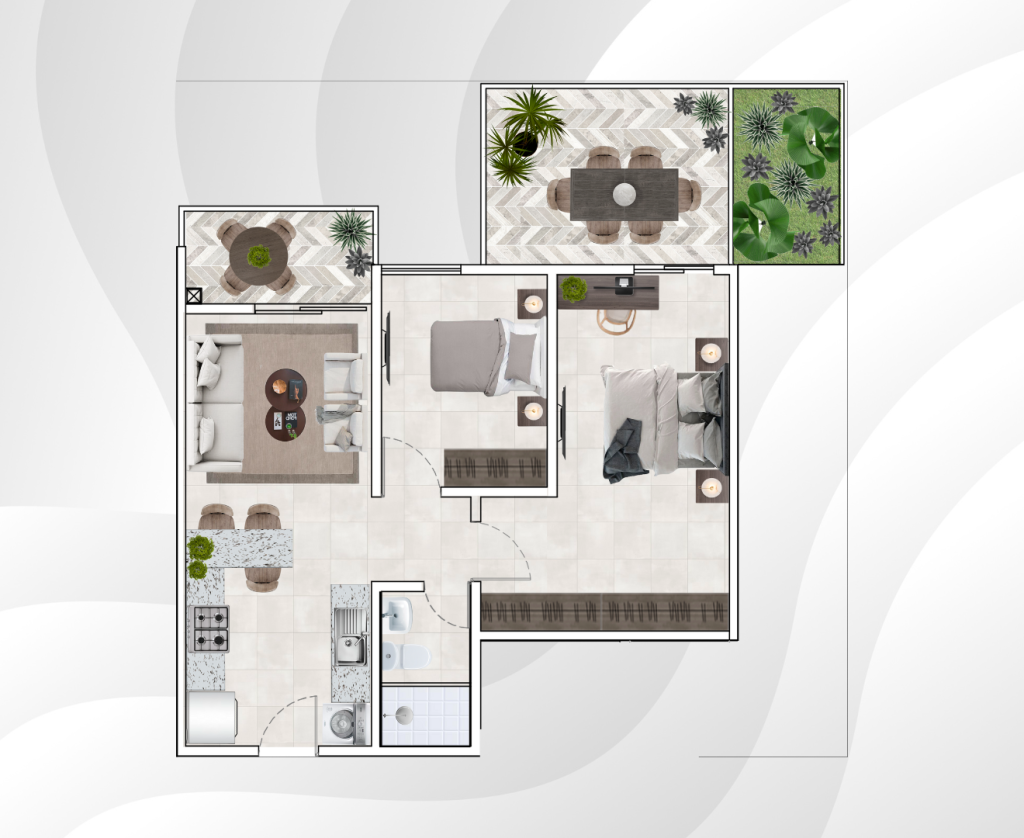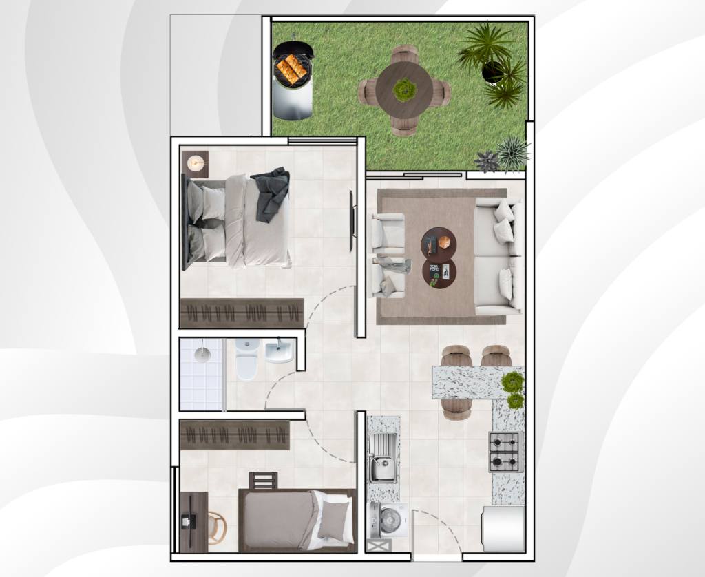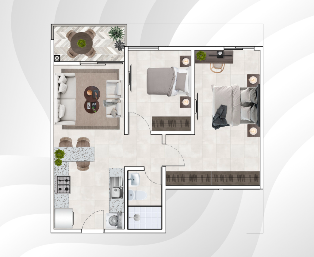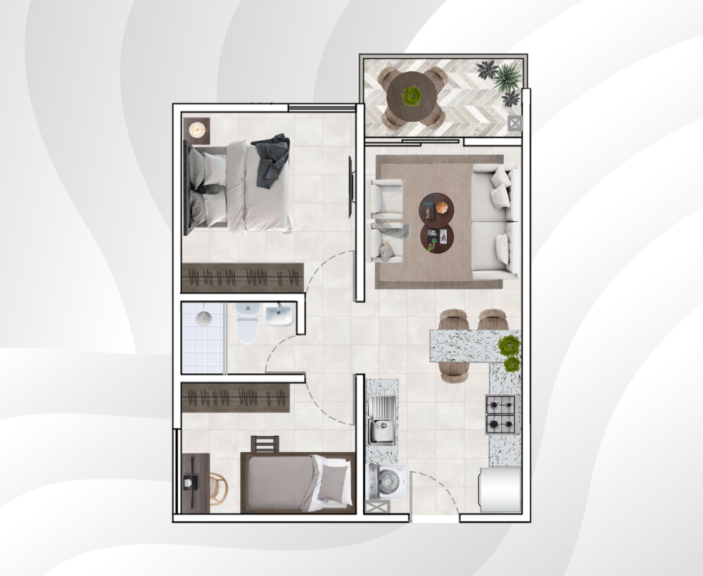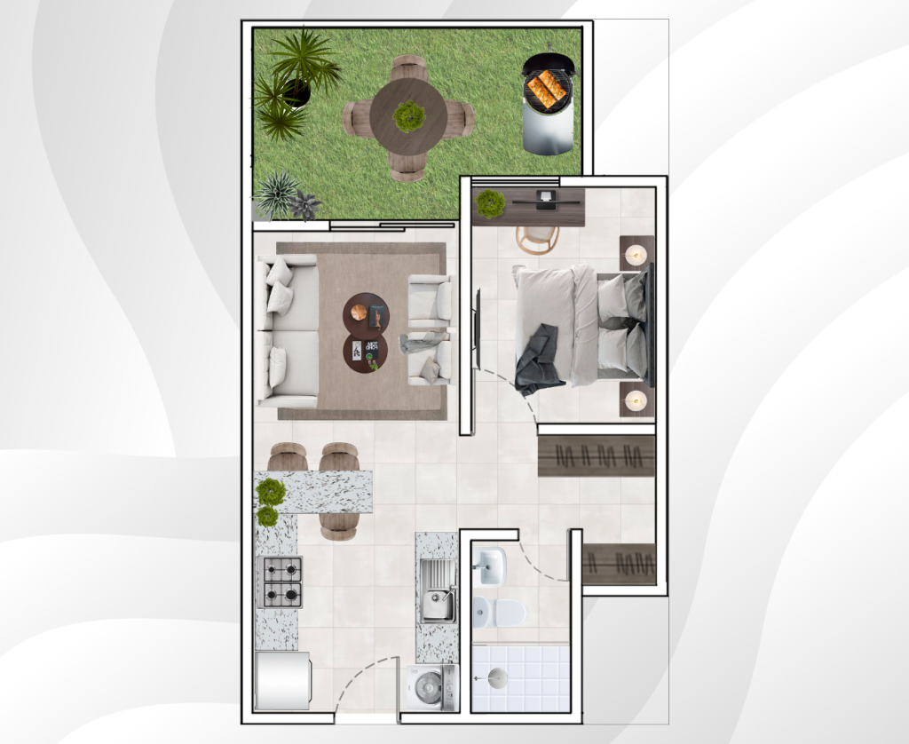 El más vendido del condominio A, con un tamaño eficiente y un hermoso balcón que amplía la sensación de espacio.