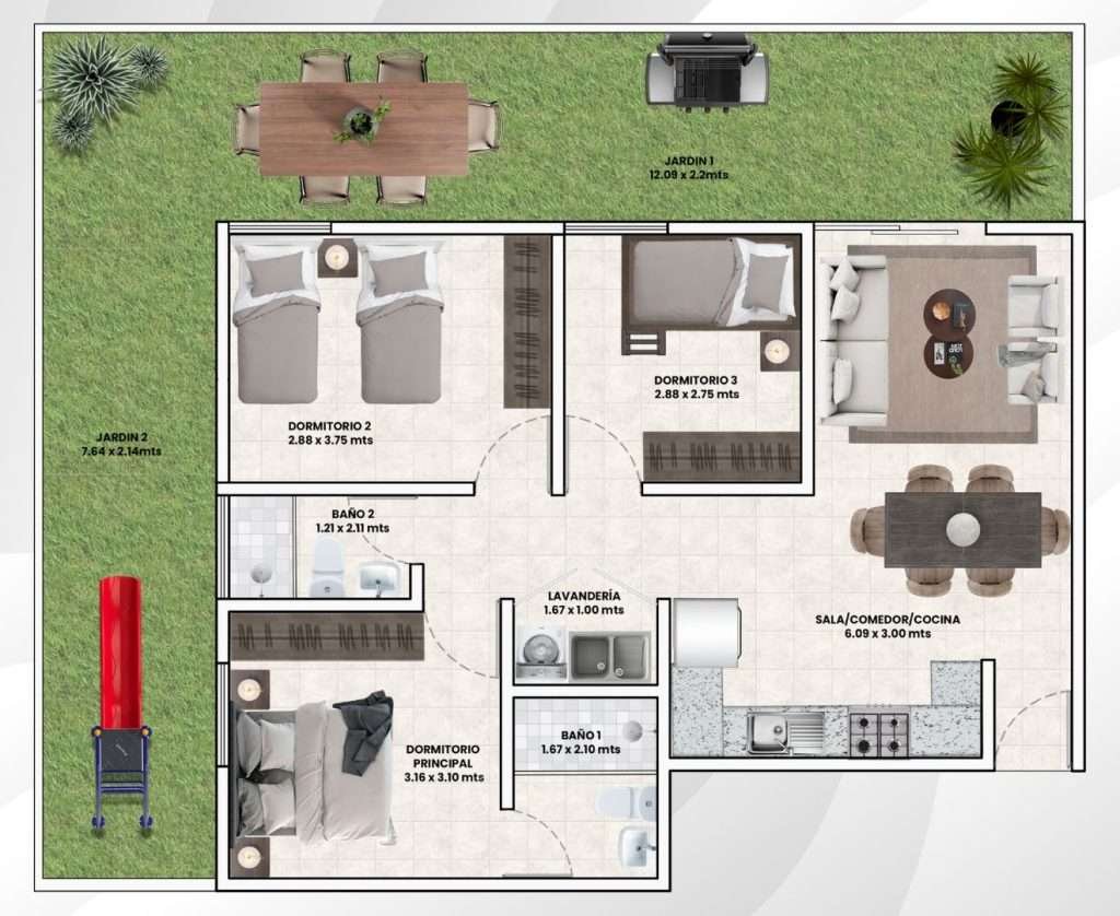 Nuestro apartamento más grande con jardín privado, ideal para familias numerosas que buscan amplitud y comodidad.